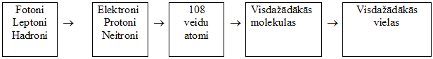 Kopsavilkumā pārvērtību procesu no elementārdaļiņas līdz vielai var attēlot šādā shēmā